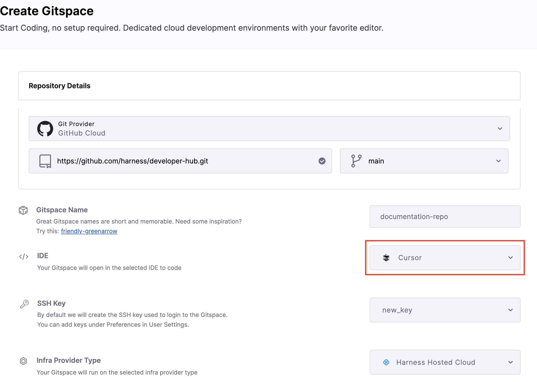 2. Select "Cursor" as the IDE during Gitspace creation.