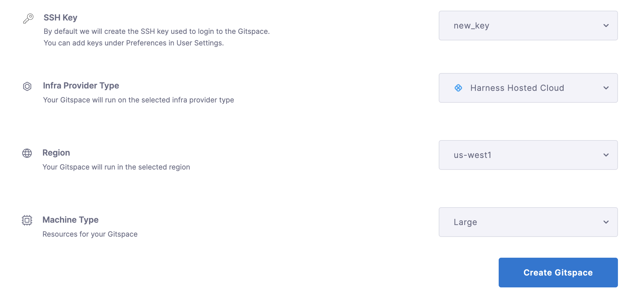 1. Navigate to the Harness UI and create a new Gitspace for your project repository.