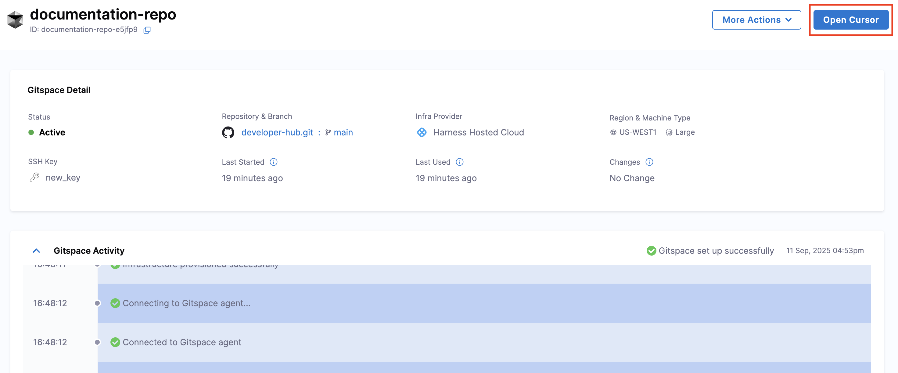 1. Once the Gitspace is created and running, click on the "Connect to Cursor" button.