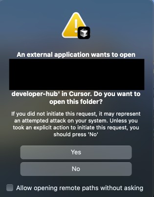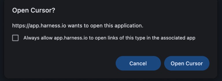 2. A prompt will appear requesting permission for app.harness.io to open Cursor and establish a connection. Click on Open Cursor.