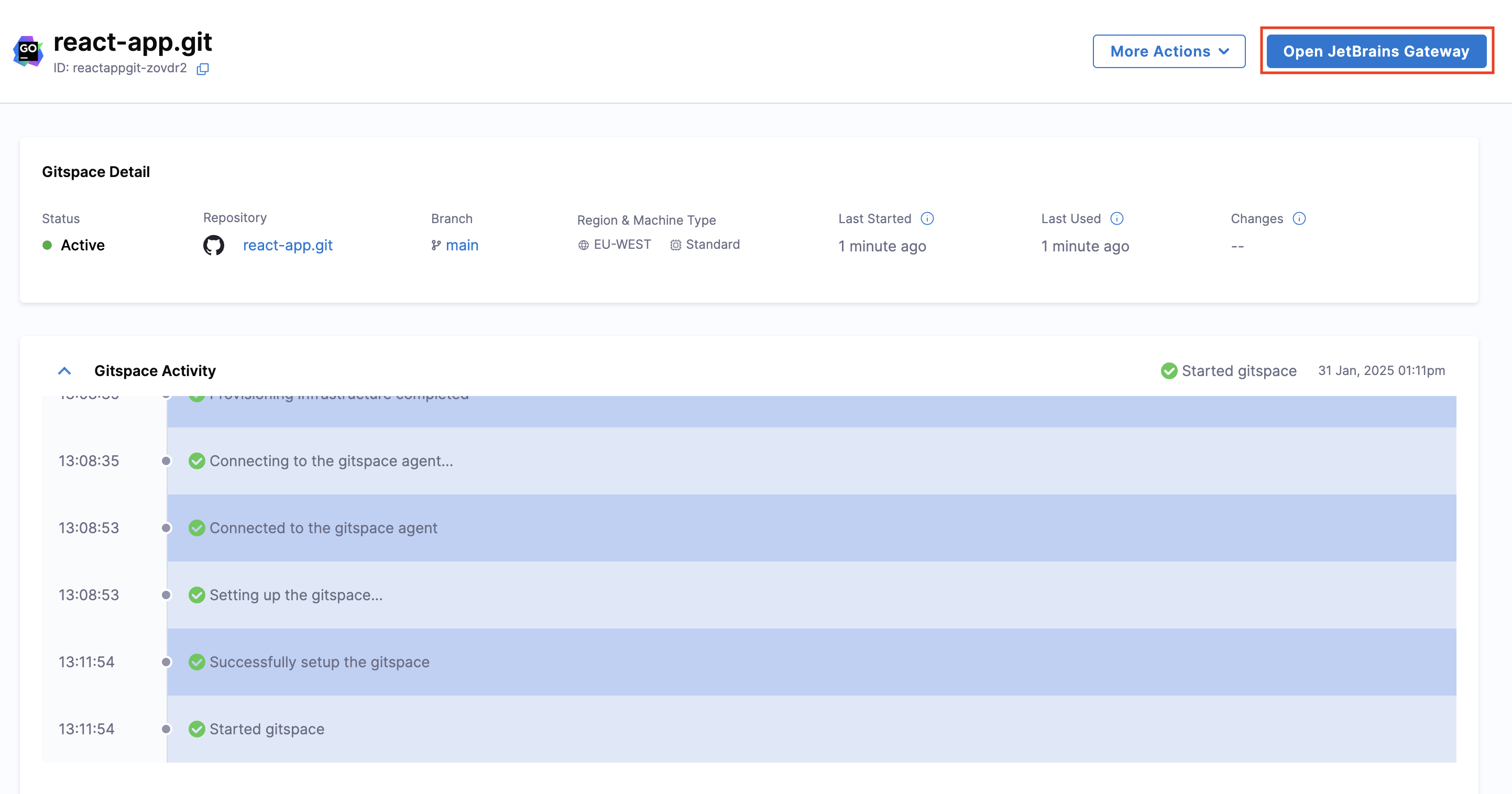 1. Once the Gitspace is created and running, click on the "Open JetBrains Gateway" button.