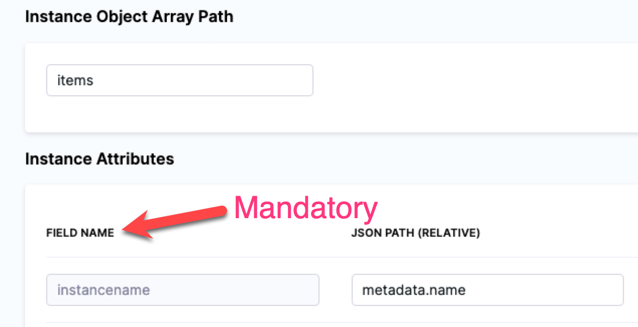 • Instance Attributes: the JSON path to the instance name label for the target instances.Mapping the fieldname instancename to the JSON Path is mandatory.You can add more instance attributes for additional target instance values you want to use.