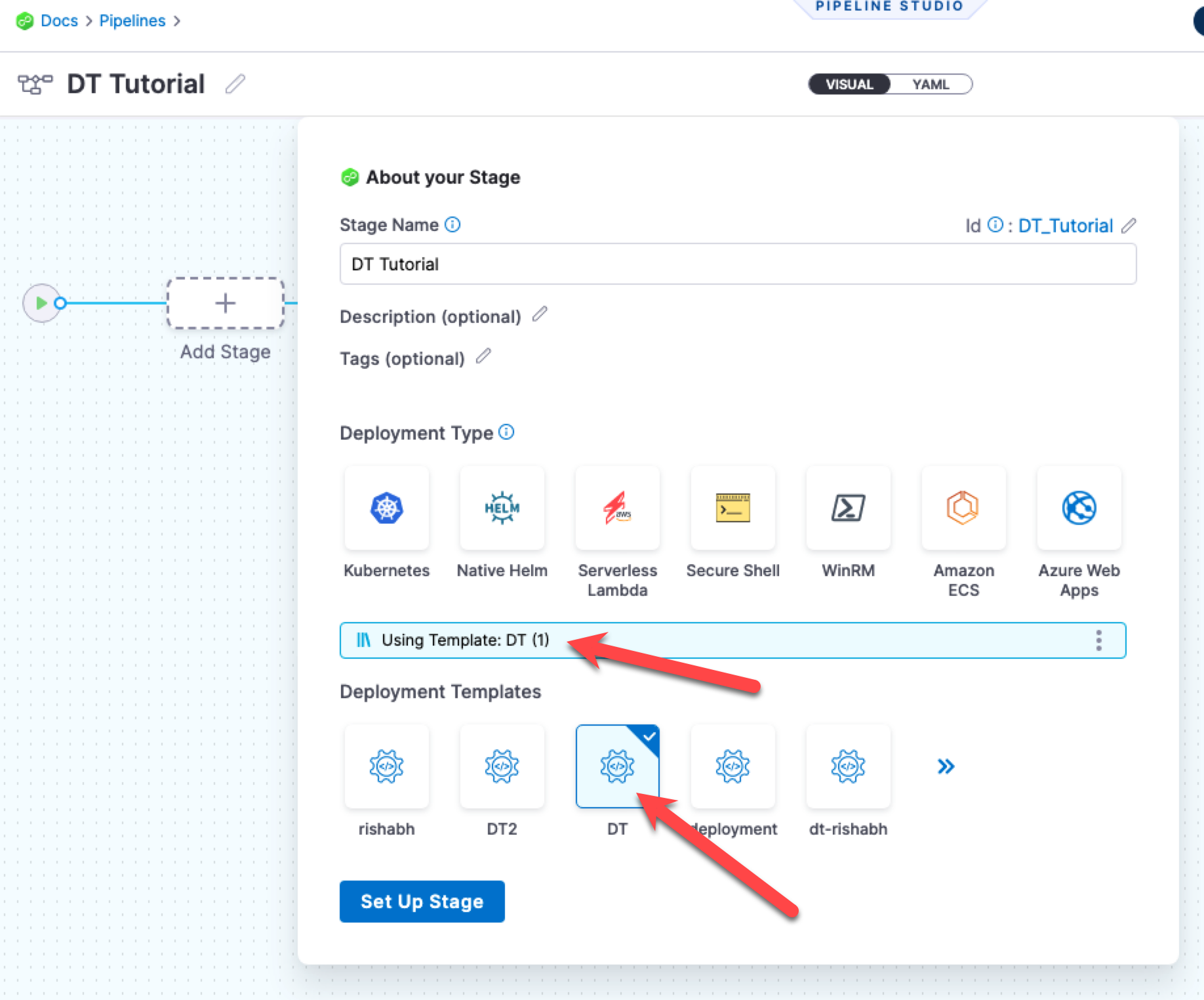 2. Create a Harness Pipeline stage using the Deployment Template type and the Deployment Template.