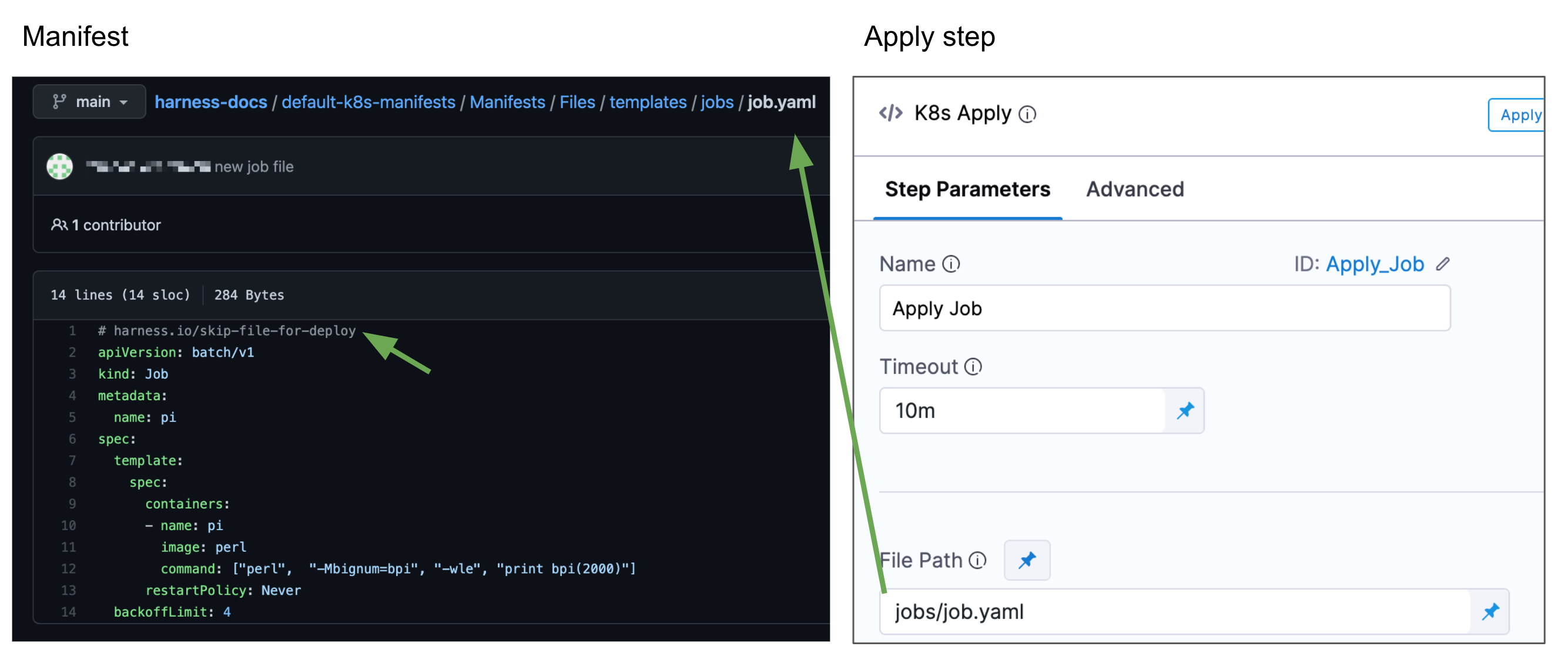 For example, the following image shows a Jobs resource in a Service Manifests section that uses the ignore comment # harness.io/skip-file-for-deploy so that the stage does not apply it, and the Apply step that specifies the same Jobs resource: