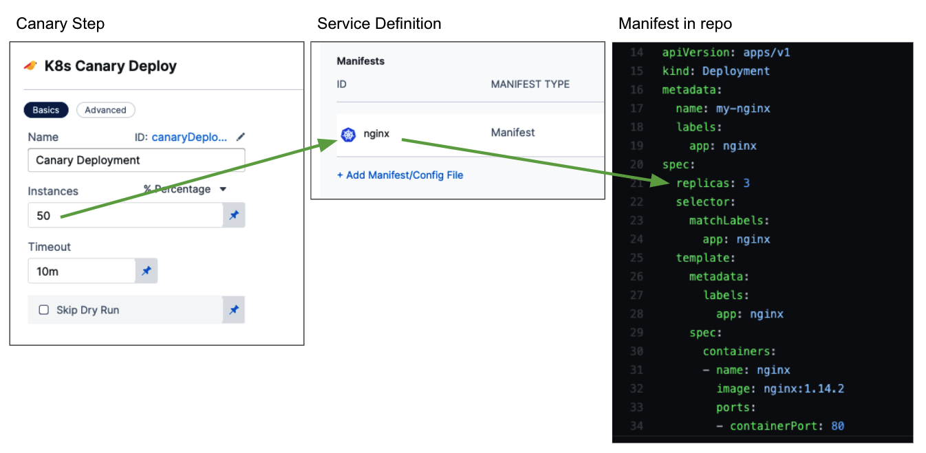 In this step, you define how many pods are deployed for a Canary test of the configuration files in your Service Definition Manifests section.