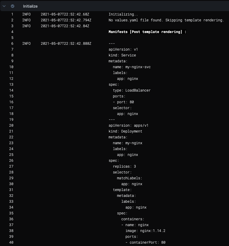 In the Initialize section of the Rollout Deployment step, you can see the same object descriptions as the Service Definition Manifests section: