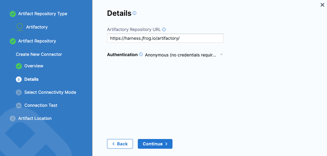 In Connect to the provider, select Connect through a Harness Delegate, and then select Continue. We don't recommend using the Connect through Harness Platform option here because you'll need a delegate later for connecting to your TAS environment. Typically, the Connect through Harness Platform option is a quick way to make connections without having to use delegates.