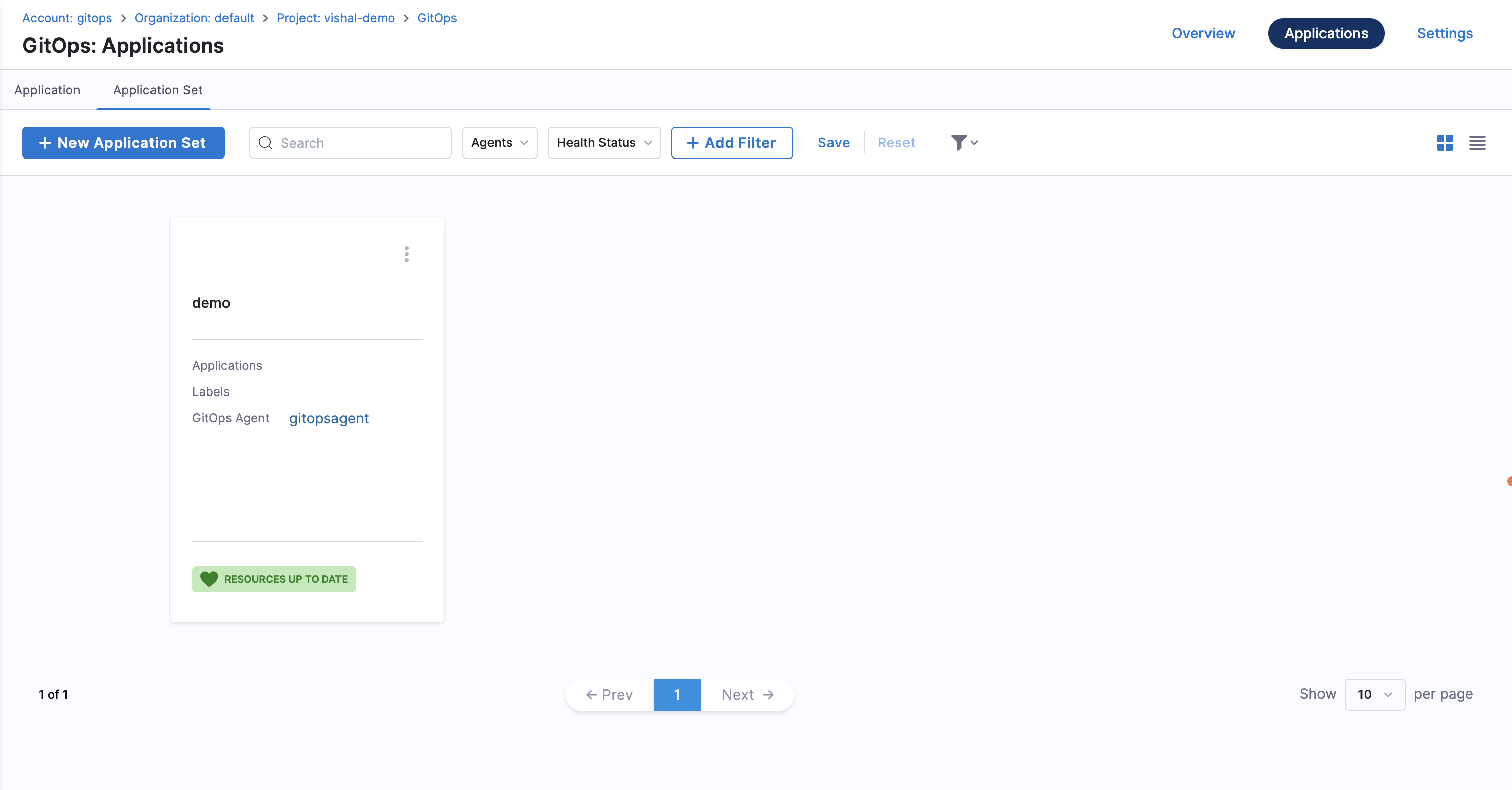 If you want more details about the applications created by the ApplicationSet, navigate to the Applications page. Filter by the agent and cluster to view the applications created by the ApplicationSet. Typically, all applications created by an ApplicationSet will use the same agent and cluster.