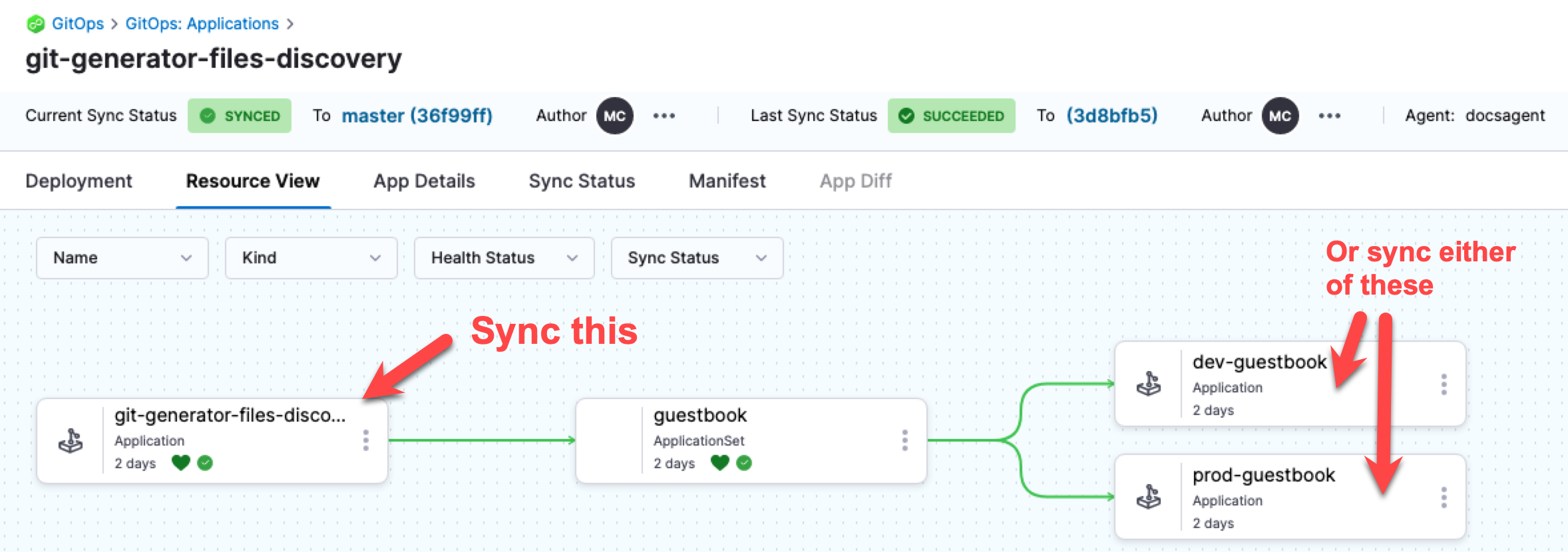 You can sync the ApplicationSet from two places: the Applications view or a PR pipeline.