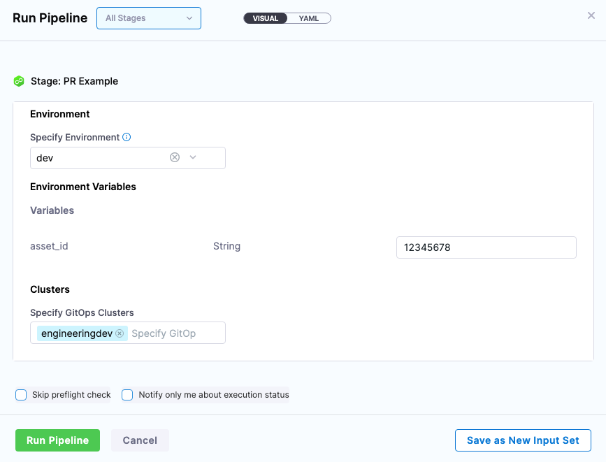 7. For the stage environment, we'll use a Harness runtime input. When you run the pipeline, Harness will prompt you for a value for the environment. You can select the environment you want to use for the PR.
