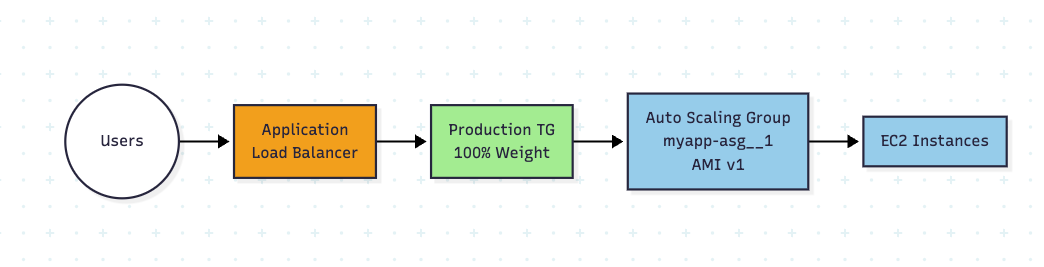 For the first deployment, Harness creates an Auto Scaling Group using your provided launch template and ASG configuration. It also creates a launch template with the same name as the ASG containing your Amazon Machine Image (AMI) and instance configuration. EC2 instances are provisioned based on your desired capacity setting and attached to the production Target Group. The ALB routes 100% of traffic to this initial ASG while the stage Target Group remains empty. This Auto Scaling Group represents the blue environment running version 1.