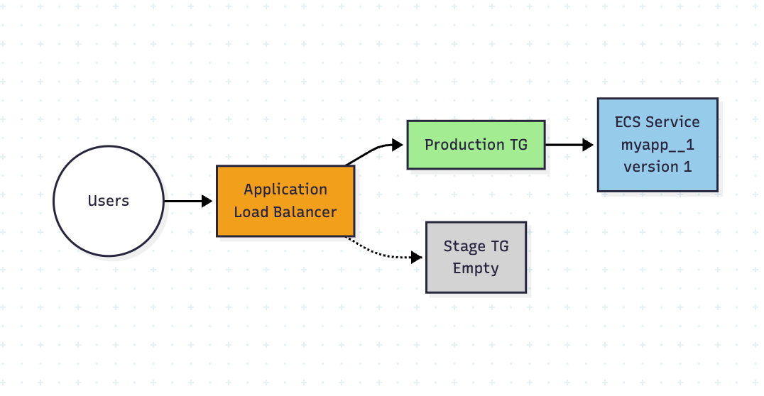 For the first deployment, Harness creates an ECS service with your task definition (version 1) and registers it to the production Target Group where it receives 100% of traffic. The stage Target Group exists but remains empty. This ECS service is considered the blue environment. The ALB production listener (typically on port 80) routes all user traffic to the production Target Group while an optional stage listener (port 8080) points to the empty stage Target Group for later use.