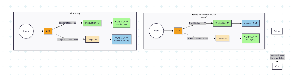 Traditional Swap Mode: Harness uses two separate ALB listeners (production on port 80, stage on port 8080). The stage listener allows you to test version 2 before swapping. Once verification passes, the ECS Blue Green Swap Target Groups step swaps the listener rules so the production listener points to the Target Group containing version 2 and the stage listener points to the Target Group with version 1. This swap is instantaneous from the user perspective.