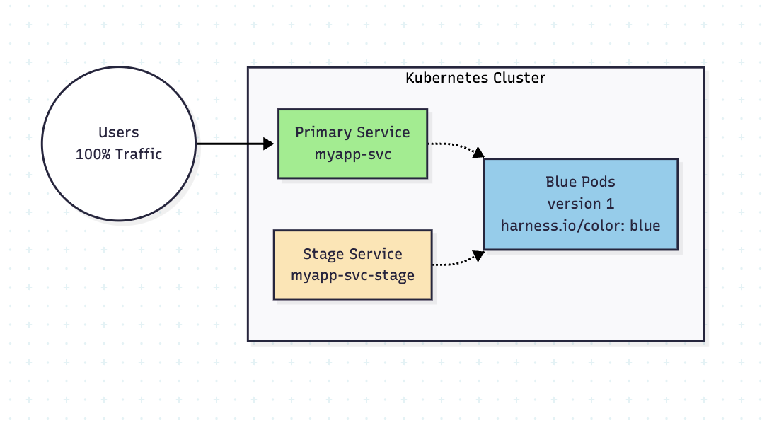 When you perform your first deployment, Harness creates a primary service (from your service manifest) and automatically generates a stage service with a -stage suffix. Both services initially point to the same set of pods labeled with harness.io/color: blue. This initial pod set runs version 1 of your application and the primary service receives all production traffic while the stage service remains available for verification. The Stage Deployment step creates the initial pods, points the stage service at them, and waits for all pods to pass readiness probes before proceeding.