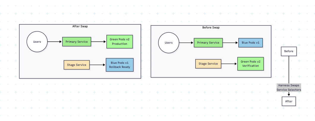 For the second deployment with version 2, Harness creates a new set of pods labeled with harness.io/color: green and reuses the existing services. The Stage Deployment step deploys the green pods and updates the stage service selector to point at them. At this point, production traffic still flows to the blue pods (version 1) through the primary service, while you can verify version 2 through the stage service. Once verification completes, the Swap Primary with Stage step updates the primary service selector to point at the green pods, instantly redirecting all traffic to version 2. The stage service selector simultaneously updates to point at the blue pods, keeping version 1 available for rollback. This traffic switch is atomic because it only requires updating the service selector label.