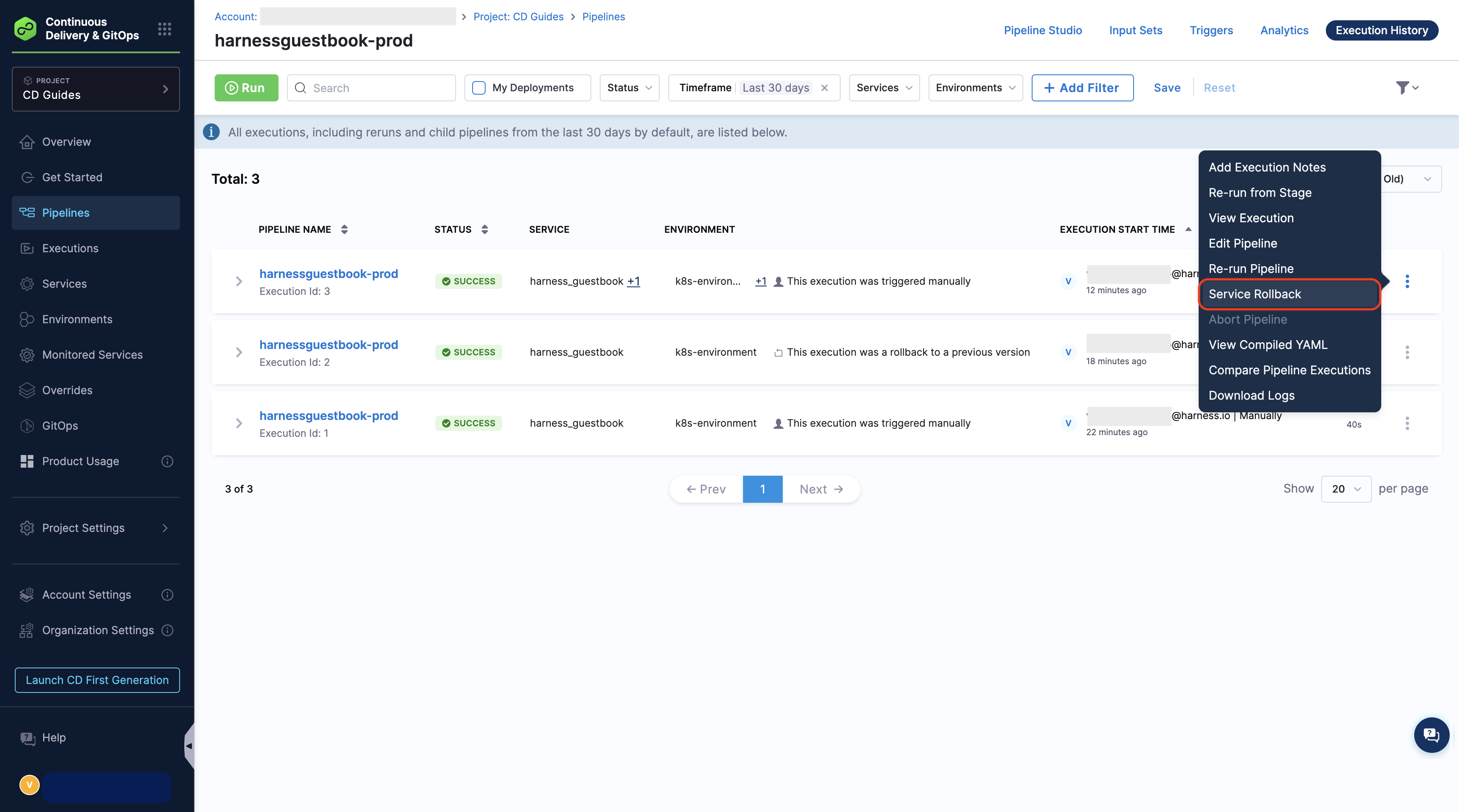 View all pipeline executions in a consolidated list format. The Rollback option is available for each successful deployment execution. Click the three dots menu to the left of the execution to access the rollback option.