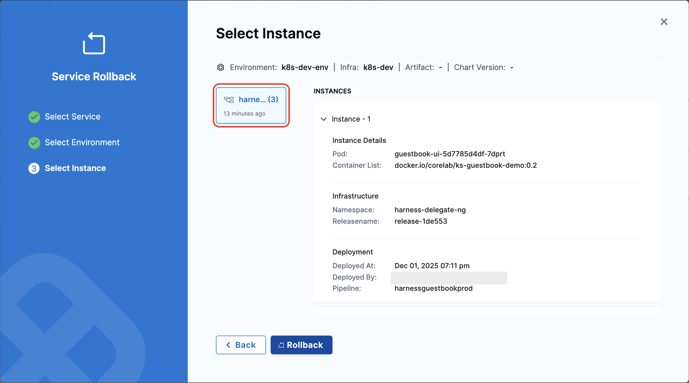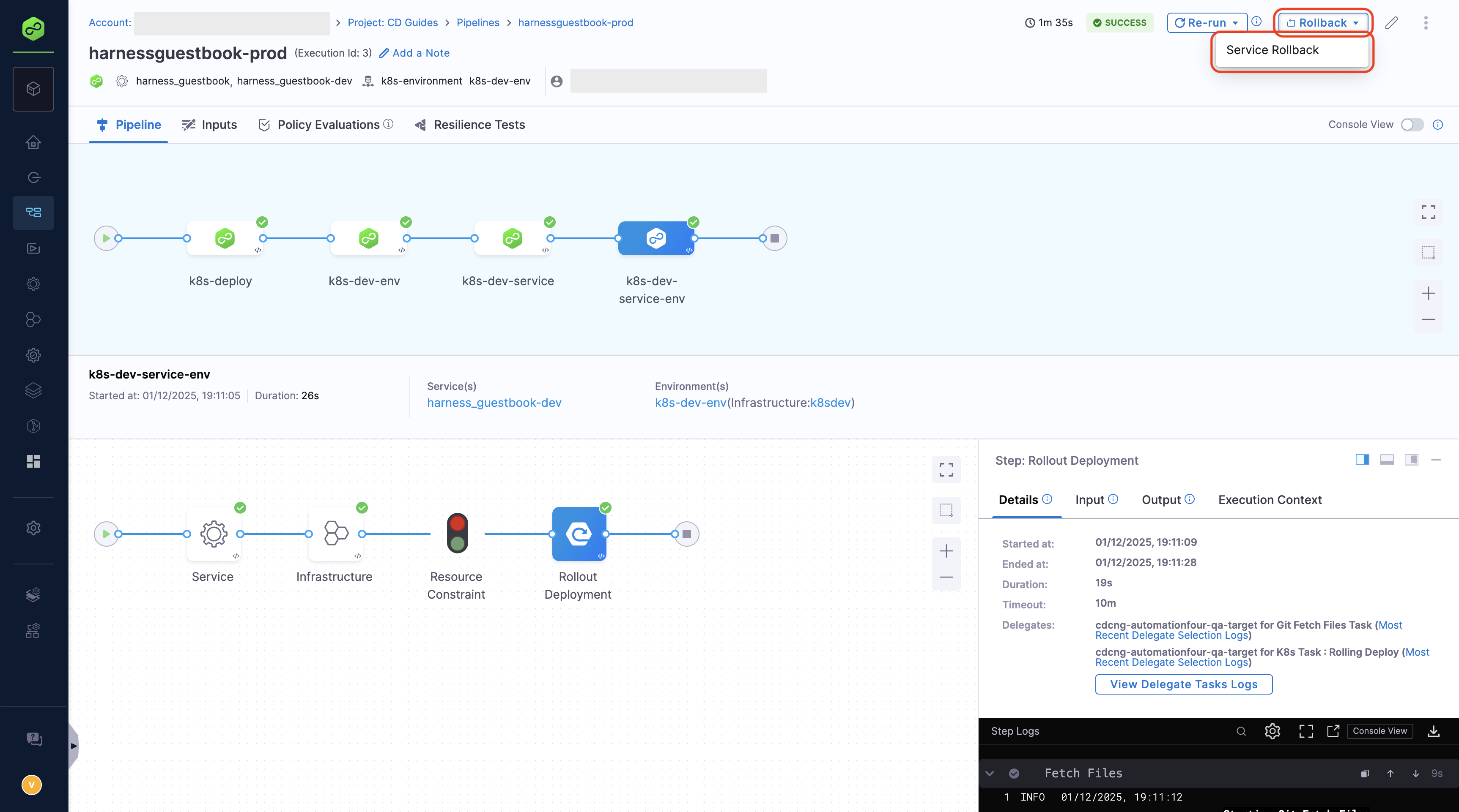 The Service Rollback feature provides a simplified and more intuitive way to initiate rollbacks directly from pipeline execution pages. Instead of navigating through instance details to find the rollback option, you can now start the rollback process with a clear, dedicated Rollback button.
