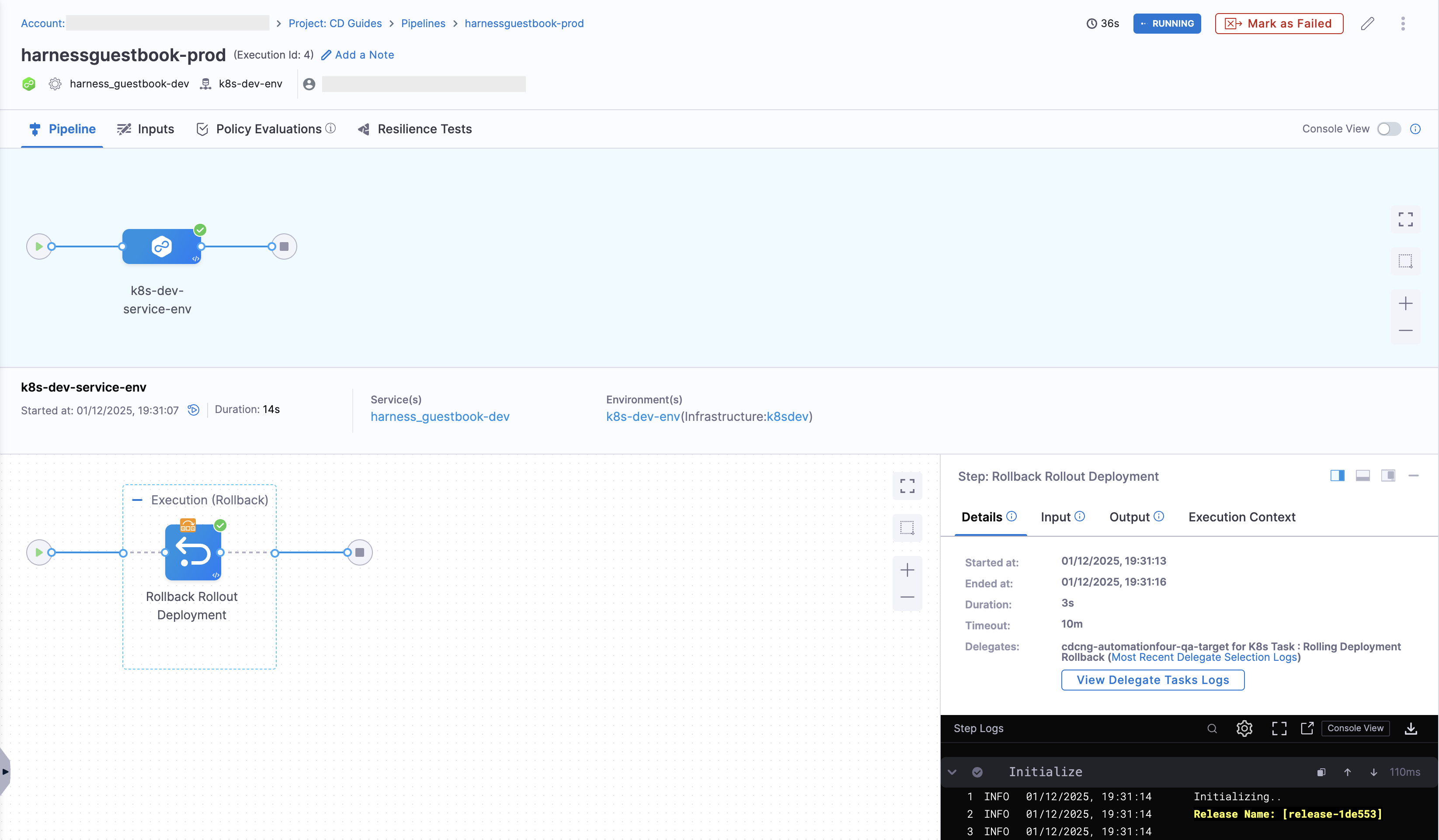 You will be directed to the pipeline execution page, and the Rollback Rollout Step will be executed.