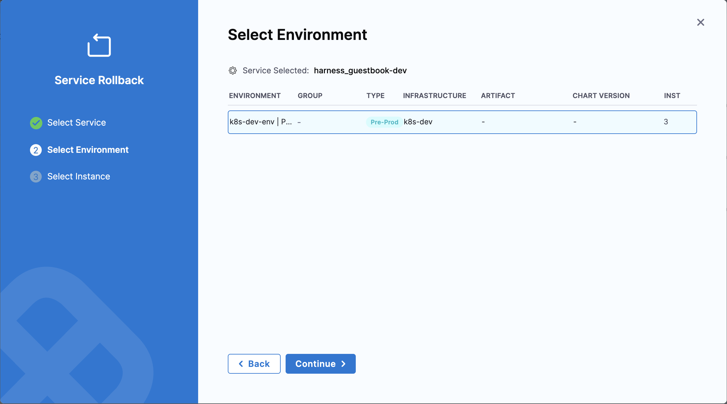 1. Select Environment: In the second step, you'll see a table showing deployment instances grouped by environment, along with details like group, type, infrastructure, artifact, and chart version. Each row represents a specific deployment state. Select the instance you want to roll back to, then click Next.