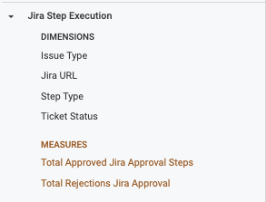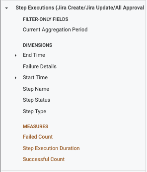 • Using fields from Jira Step Execution automatically filters the data to stages that contain Jira steps (Create, Update, Approval).