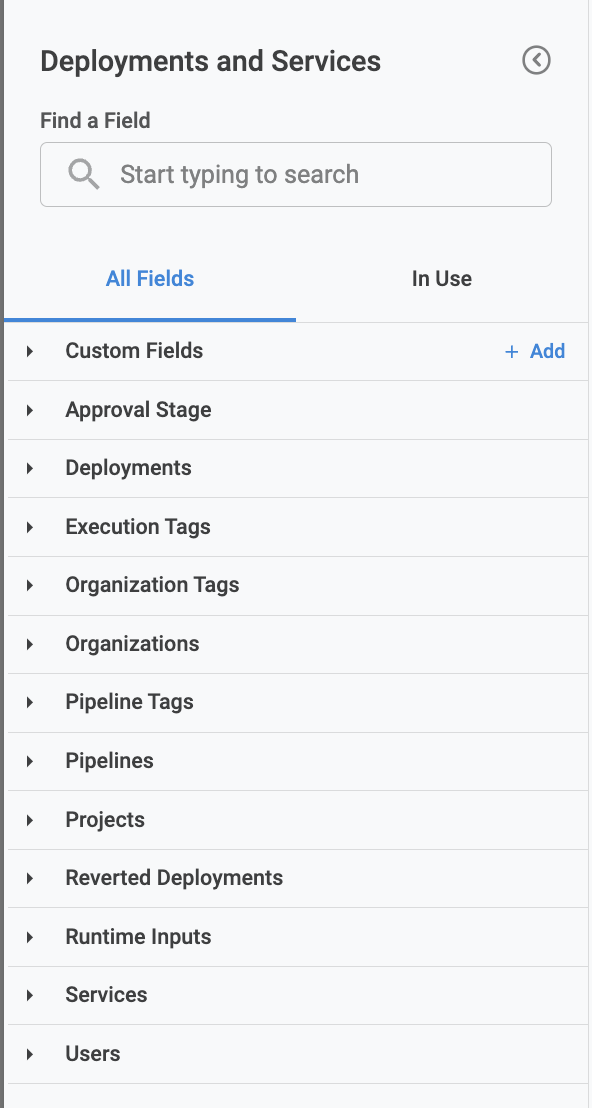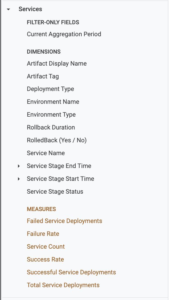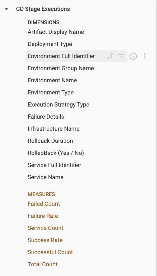 • When you select CD-specific fields (for example, from CD Stage Execution Helm Manifest Info, CD Stage Executions, Environments, or Services views), the data displayed will only include CD stage–related executions.
