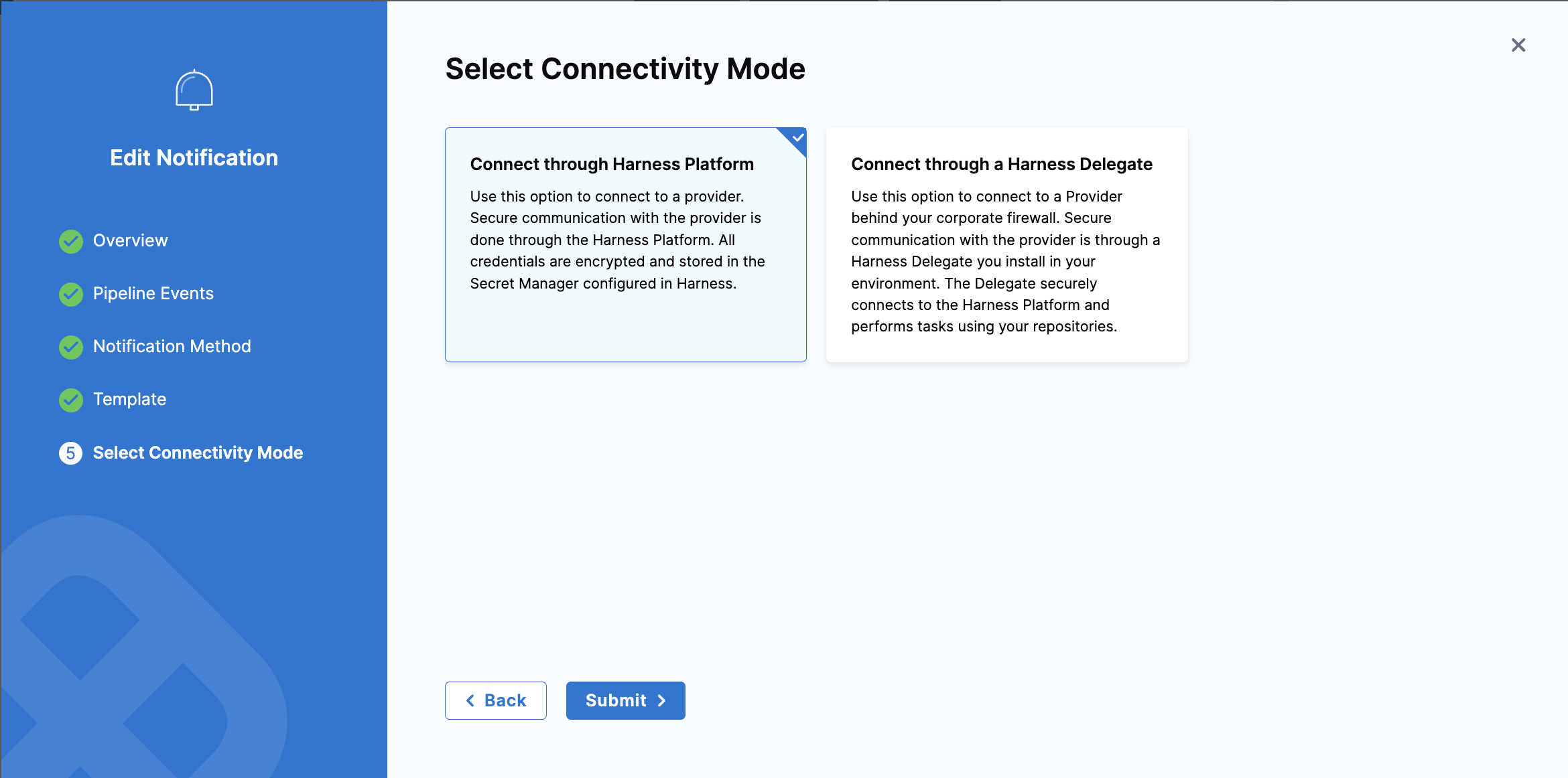 Under Select the Connectivity Mode, you can choose to Connect through Harness Platform or Connect through Harness Delegate.