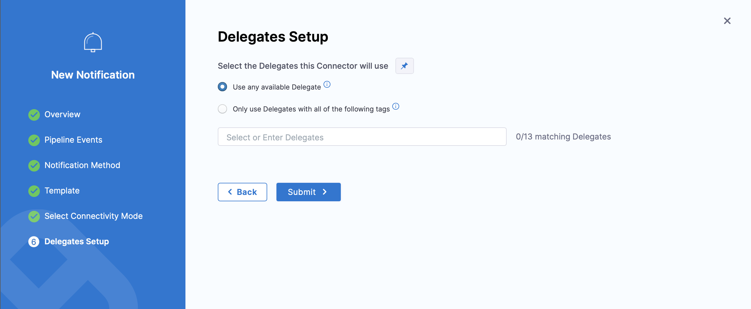 When you select Connect through Harness Delegate, and click on Continue, you will be asked to select the Delegate that this pipeline notification rule will use, in Delegate Setup.