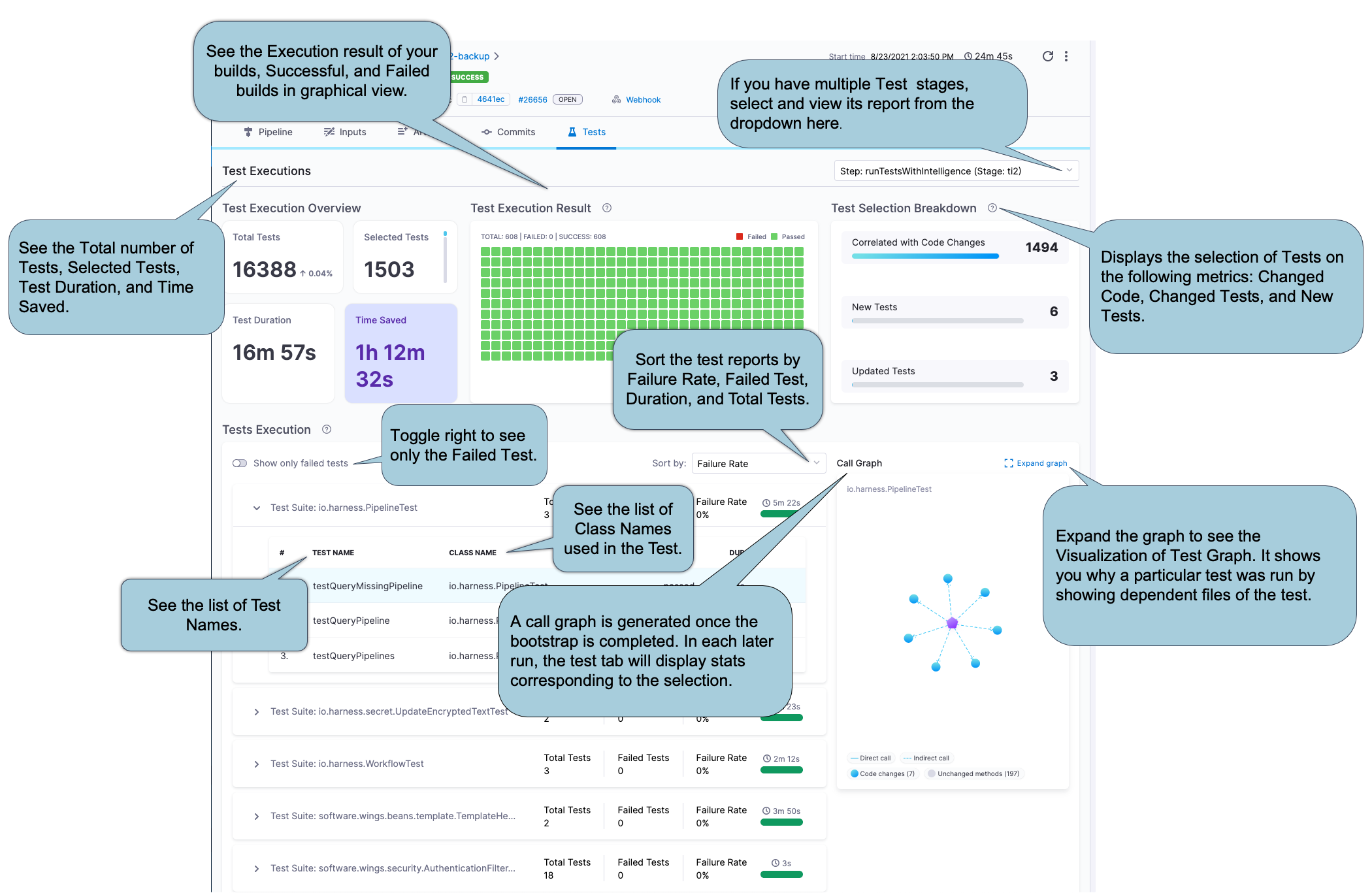This section provides an overview of Total Tests, number of Selected Tests, total Duration of all tests, and Time Saved.