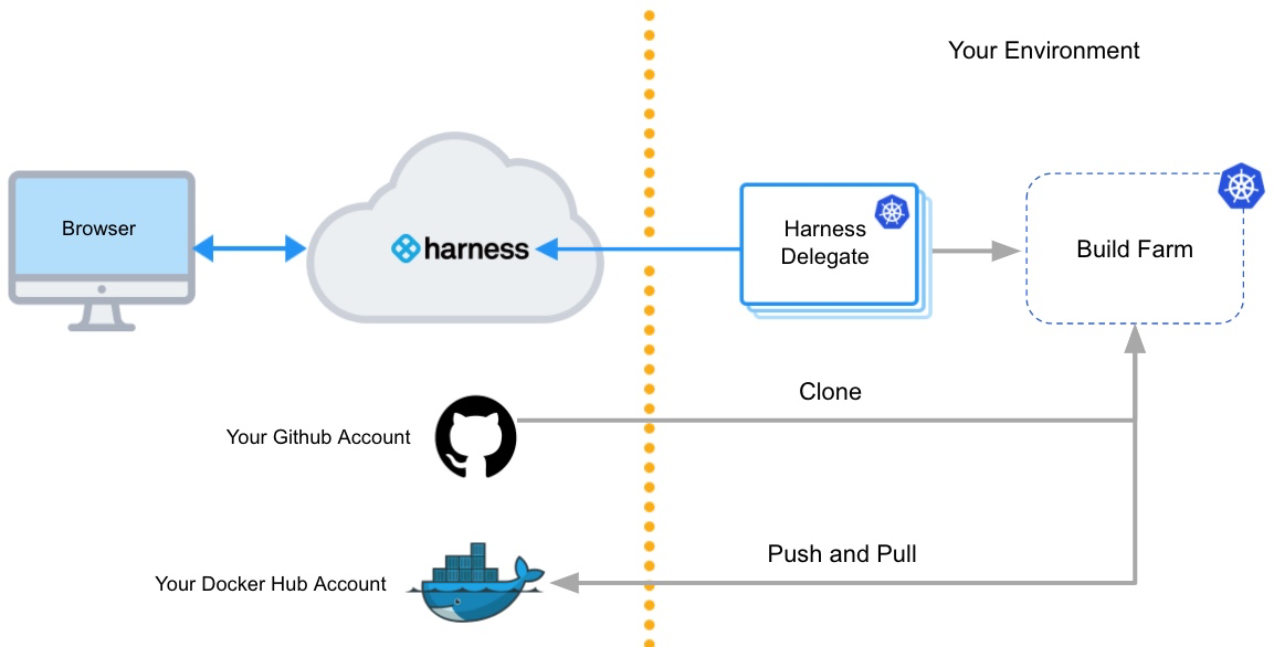 The following diagram shows the architecture of a kubernetes cluster build infrastructure. You interact with the Harness Platform through your browser. The Harness Delegate, which is installed in your Kubernetes cluster, manages communication between the Harness Platform and the Kubernetes pod where the pipeline's build farm is running. While the pipeline runs, the build farm communicates with your codebase, such as GitHub, and container registry, such as Docker Hub.