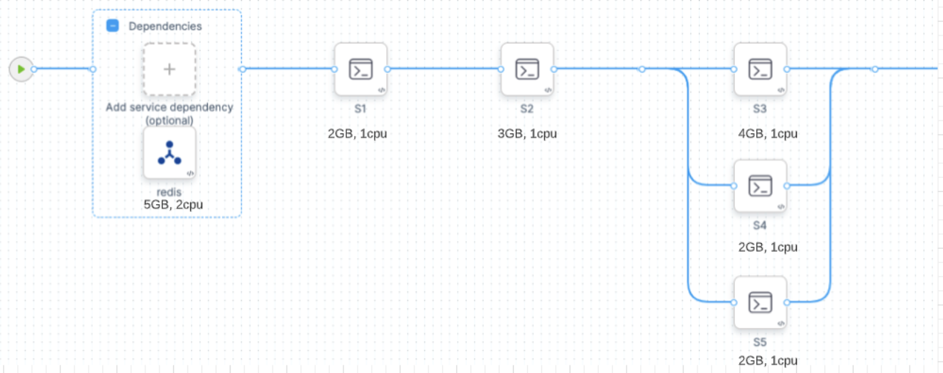 Kubernetes would allocate a pod based on the maximum requirements for the overall stage. In this example, the peak requirement is when the s3, s4, and s5 steps run in parallel. The pod also needs to run the Redis service at the same time. The total maximum requirements are the sum of Redis + s3 + s4 + s5: