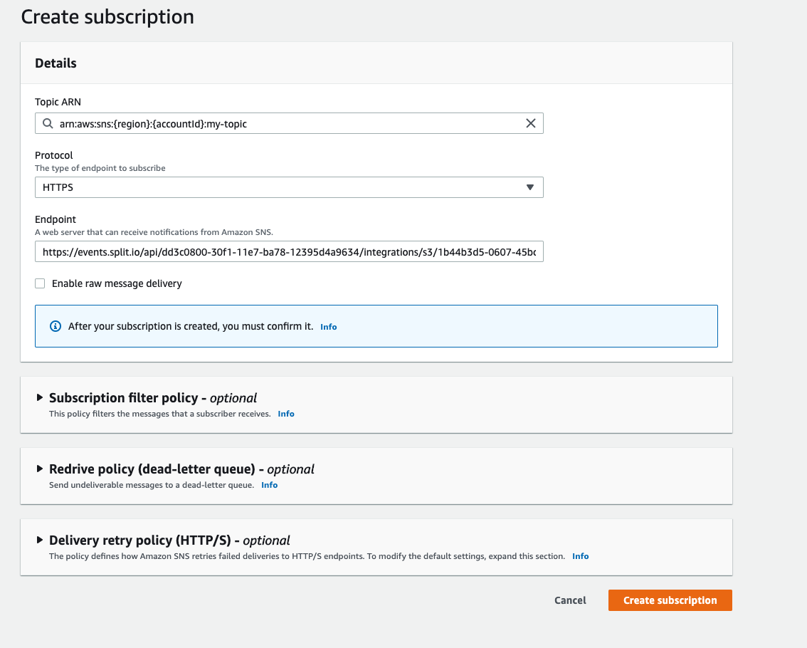 5. Click Create subscription. On the confirmation page, confirm that Check status is "confirmed” and Protocol is “https."