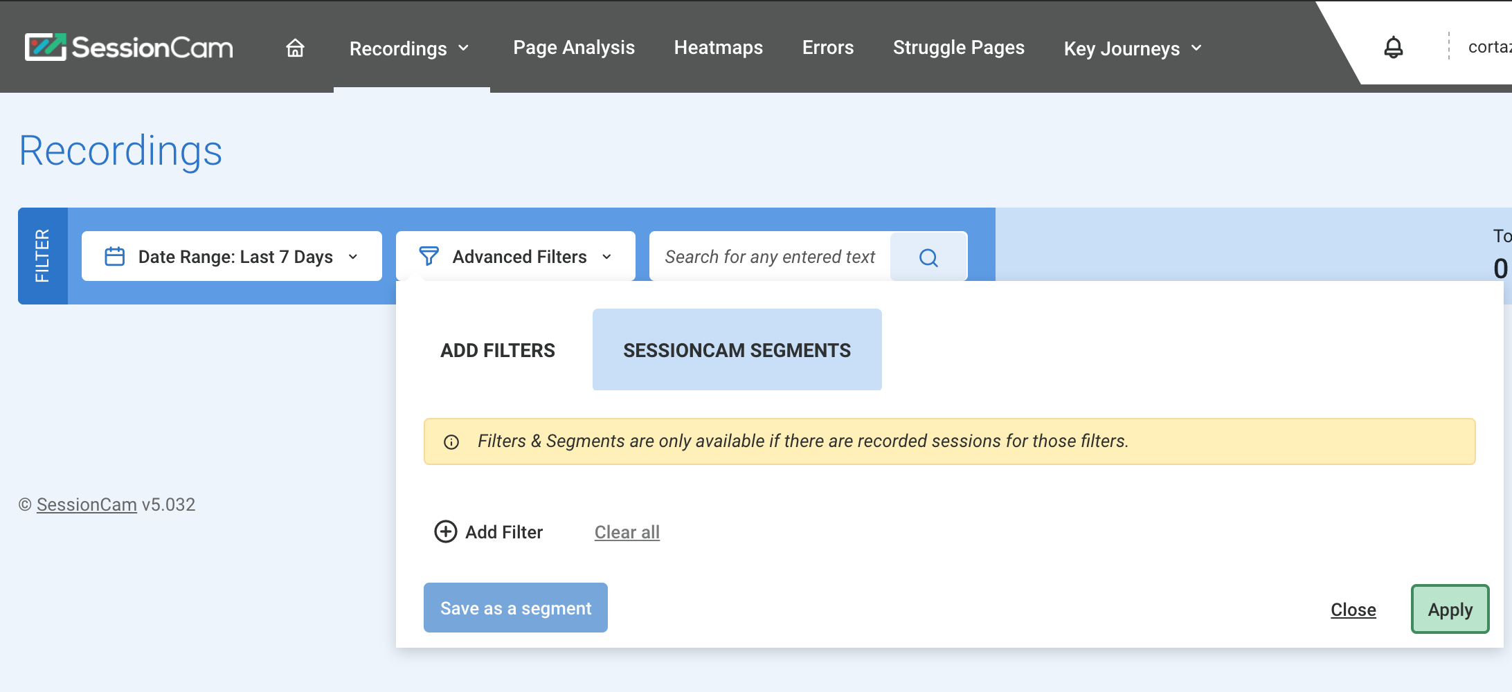 To view the correlated sessions in SessionCam, use the Advanced filter: