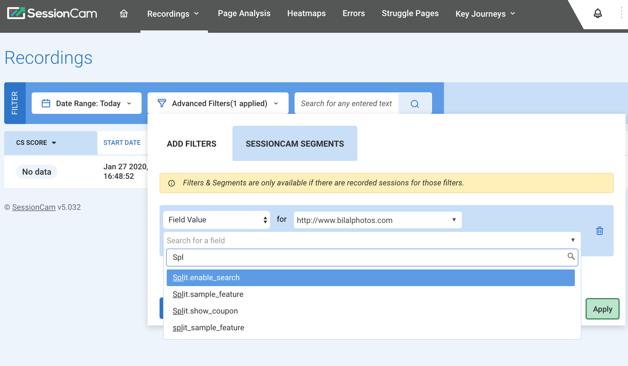 3. Select which feature flag you like to filter. You can enter split. and SessionCam displays the available stored variable names.