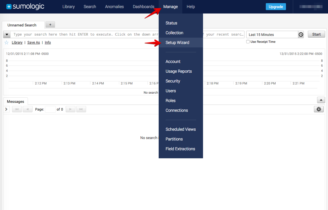 1. Click Manage and Setup Wizard from the dropdown to set up new streaming data.