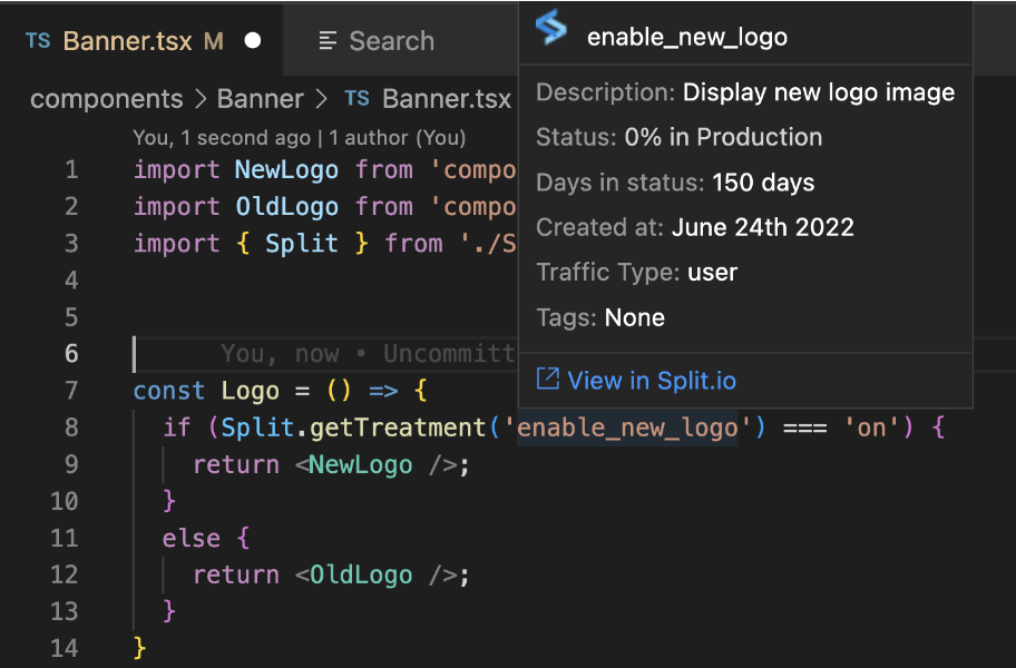 Recognizes feature flags in code. Within the code itself, you can hover over any strings within quotes and if it recognizes it as a flag from your list, it displays information about the flag, for example, the description, status, traffic type, etc. You can also view it within Harness.