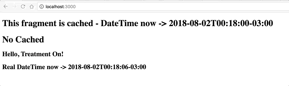 Rails has built-in support for fragment caching, which can be used to cache parts of views that do not vary between users. We updated the previous view to show a cached fragment along with a non-cached one that is recreated on each request.