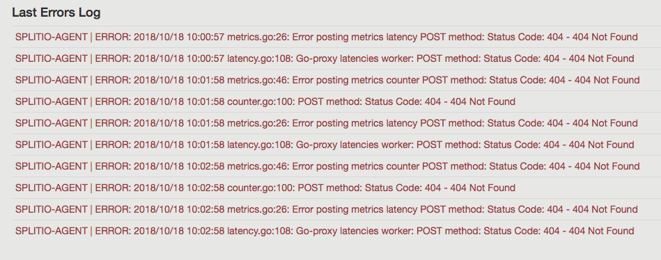 SPLITIO-AGENT - DEBUG - 2020/10/12 21:41:51 logger.go:35: GET |500| 285.71µs | 10.10.6.249 | /api/splitChanges