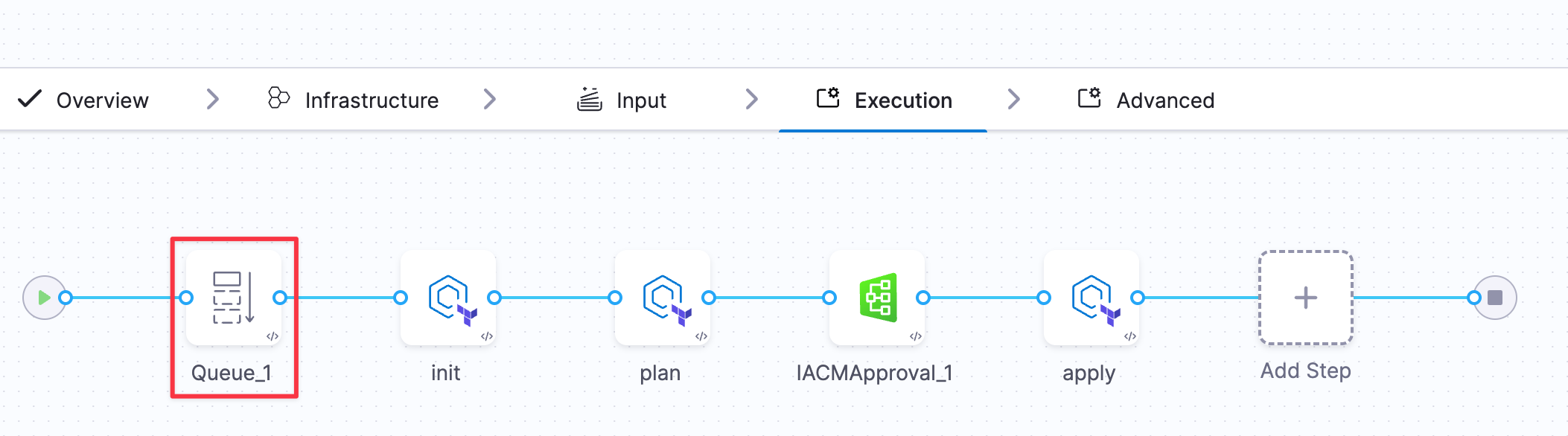 The Queue step serializes IaCM stage executions that target the same workspace. It prevents concurrent runs from conflicting with each other and provides a deterministic order of execution per workspace.
