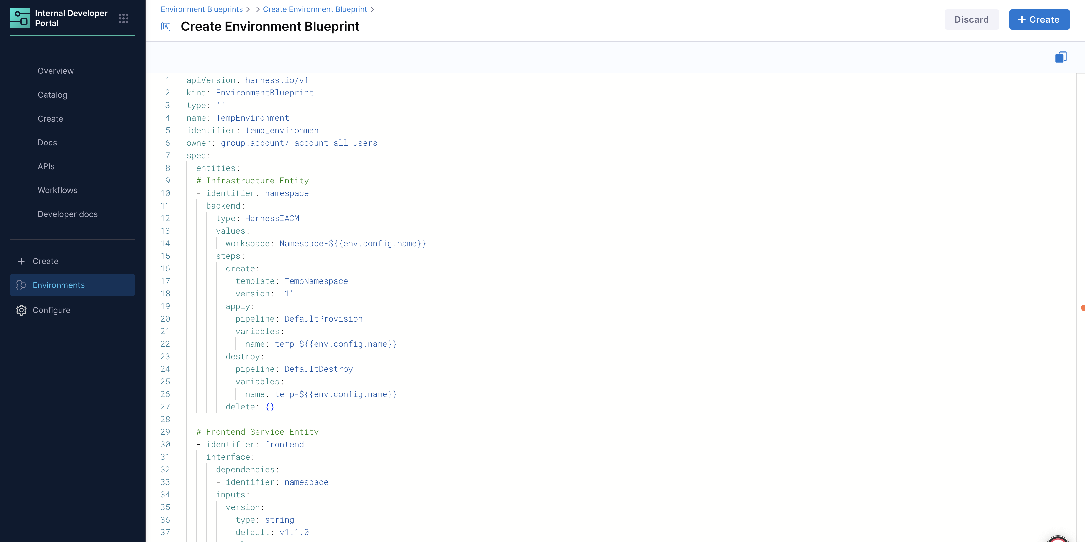 In Harness IDP (Environments), navigate to the Environments section, and hit “Create” and then “Environment Blueprint”. Use the YAML provided above to create the environment blueprint.