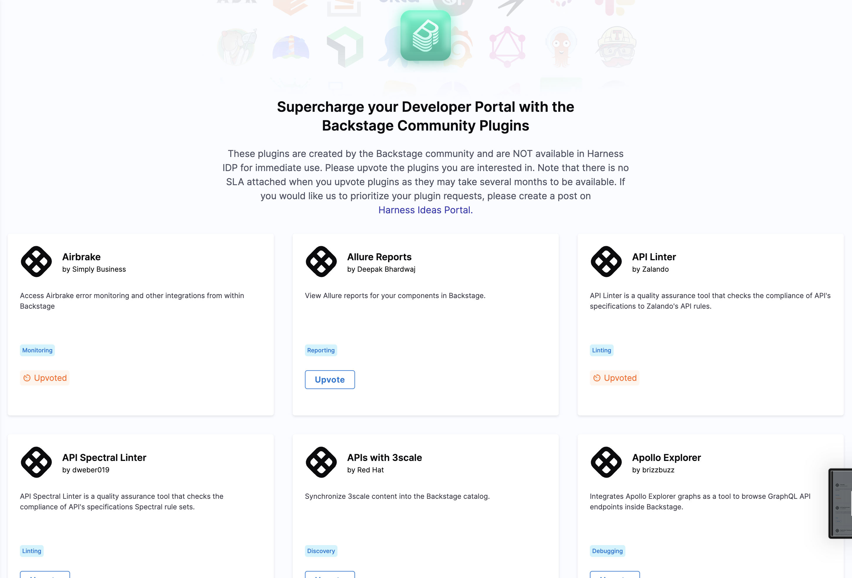 In the "Explore Plugins" view, you can upvote a plugin to be added to Harness IDP. This allows the users to upvote a plugin and help the Harness IDP team prioritize customer requests. The team will review the plugin, scan it for security vulnerabilities, and, if approved, add it to the IDP. It generally takes 4-8 weeks for a new plugin to be available in the marketplace to use.