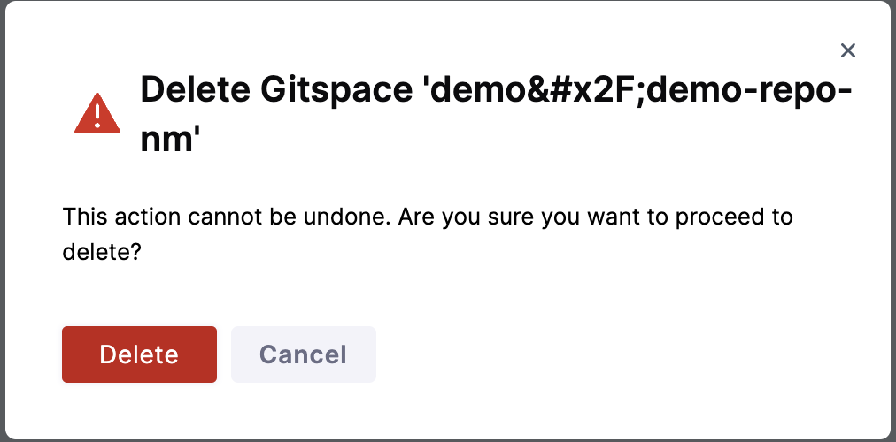Deleting a Gitspace is an irreversible action since deleted Gitspaces cannot be restored.