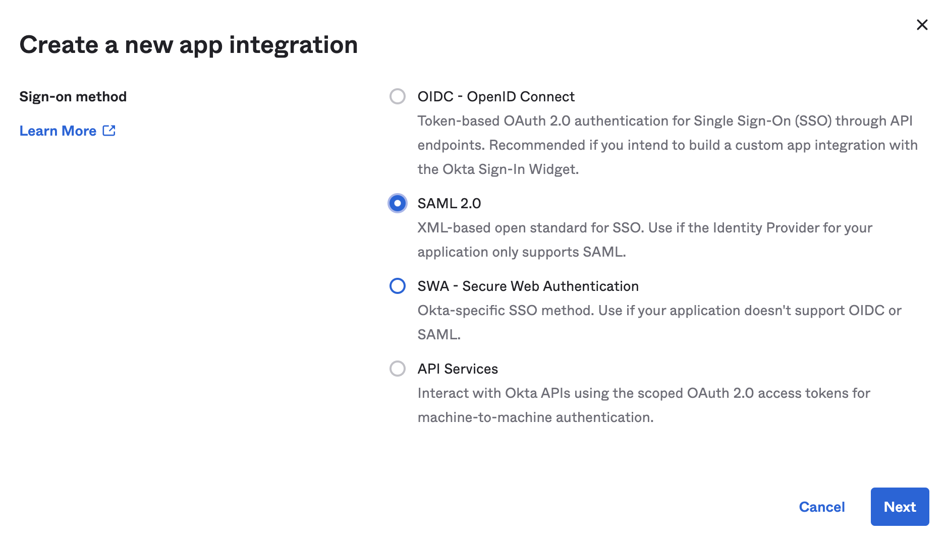 On the Create a new app integration page, select SAML 2.0 for the Sign-on Method, and then select Next.