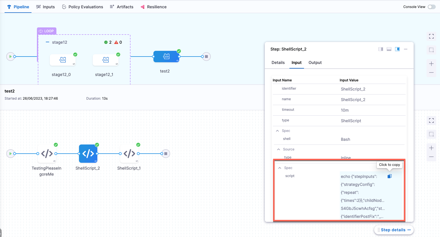3. Run the pipeline to get the JSON. In the execution logs, go to the Shell Script/Run step's Input tab to find the resolved value for the expressions in the script.