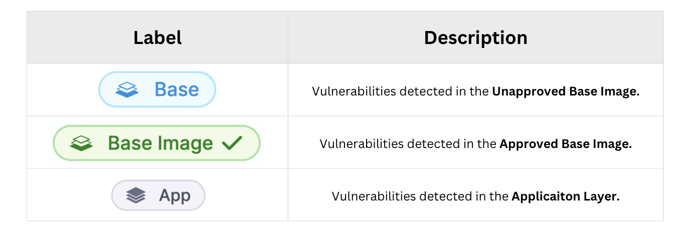 • Base Image label in Green color: vulnerabilities detected in an approved base image. Refer to Approve Base Image for more details.