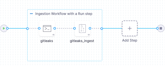 The following pipeline illustrates an orchestration workflow where the Gitleaks step scans the codebase and ingests the results in one step.