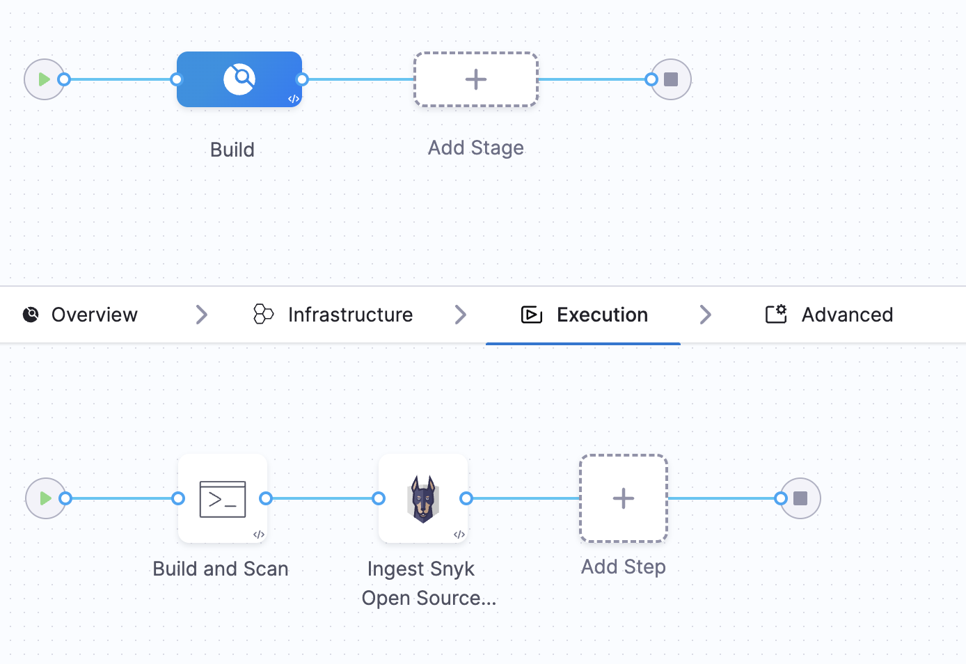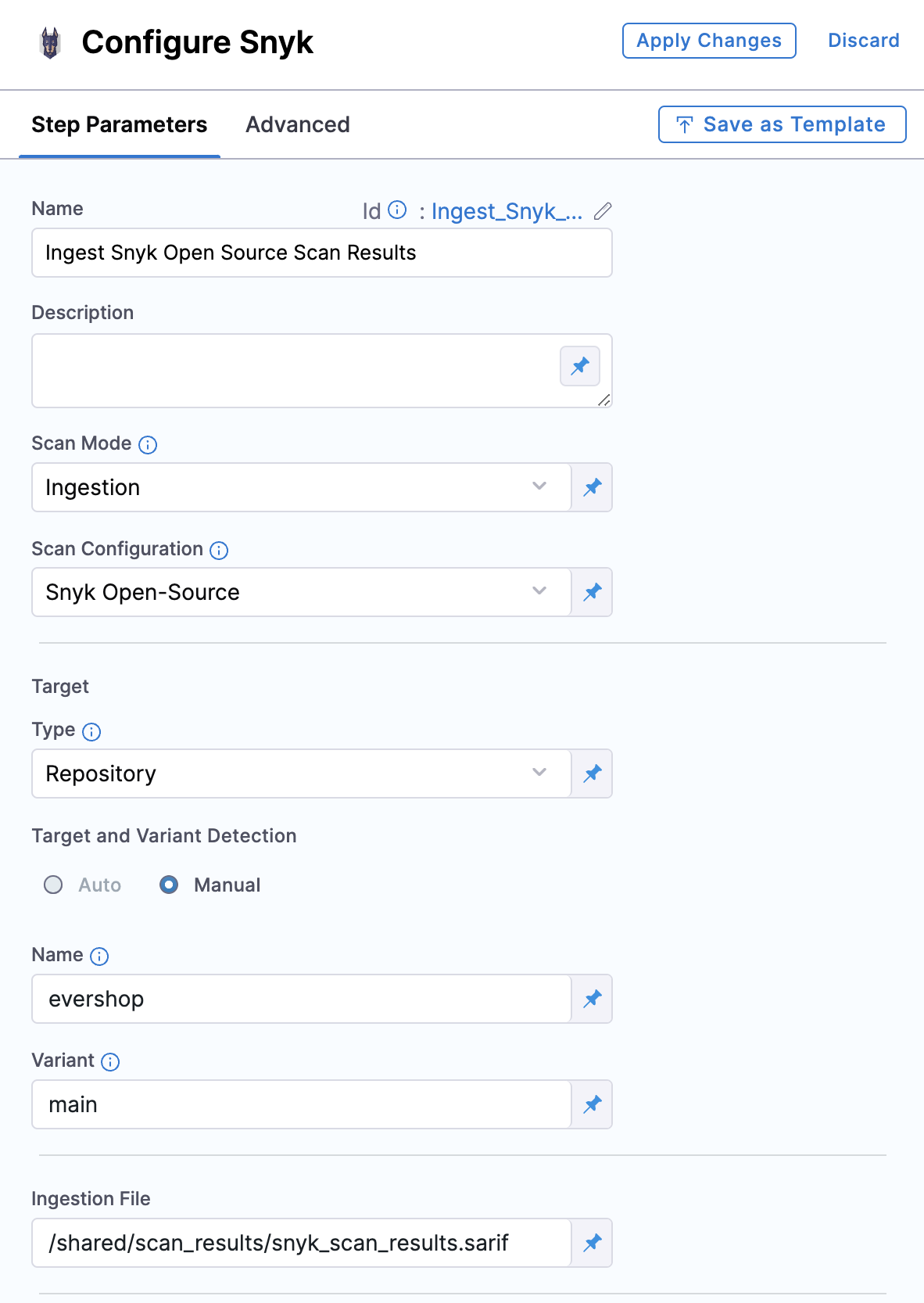 In the Ingestion scan mode, the Snyk step reads data from a file, normalizes it, and deduplicates it. To perform a Snyk Open Source scan using the Ingestion scan mode, we will use two steps: