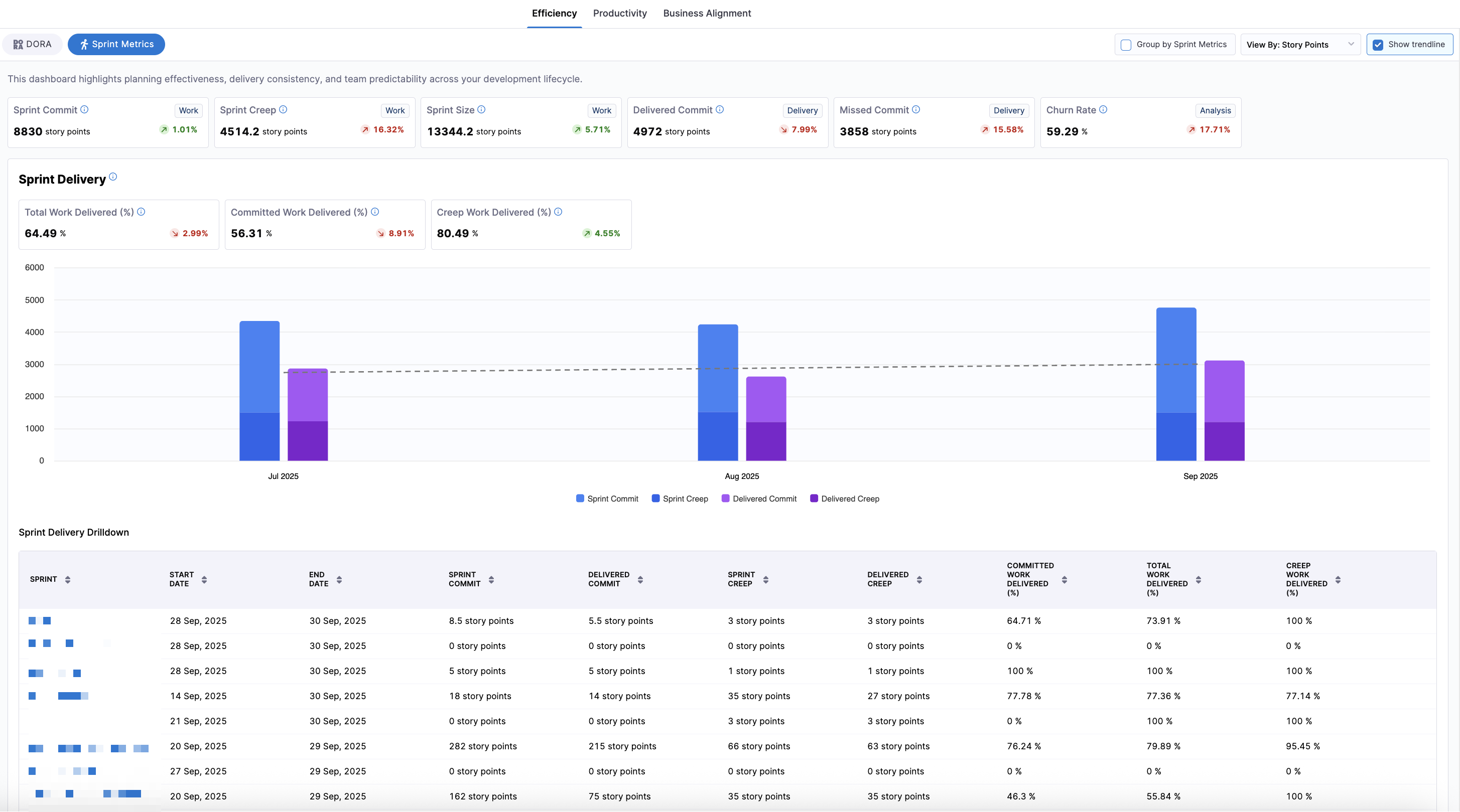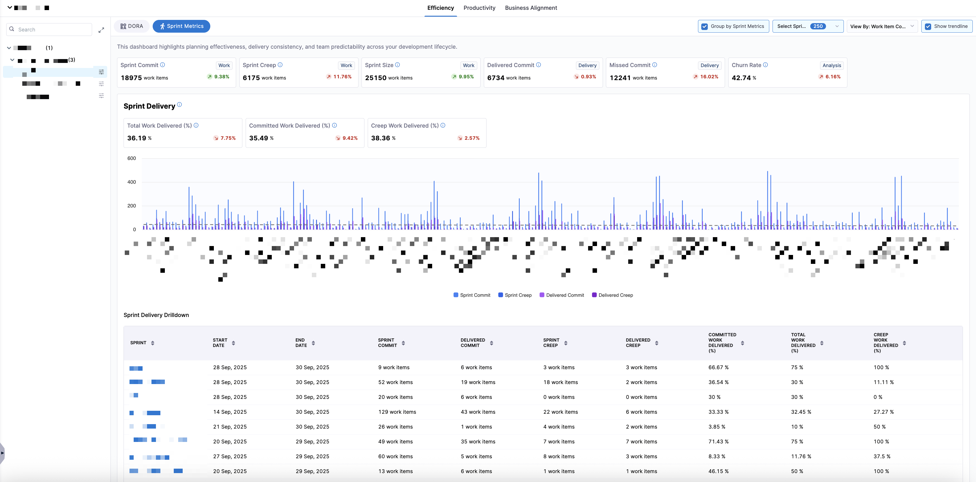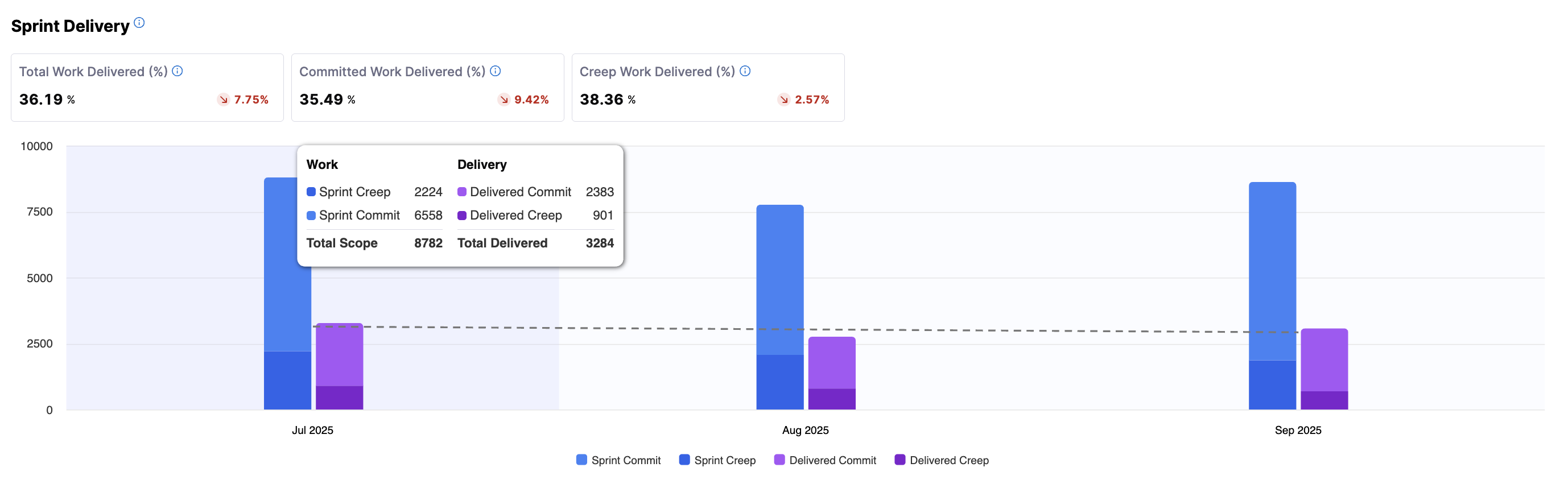 - Delivery efficiency (Total Work Delivered %, Committed Work Delivered %, Creep Work Delivered %)