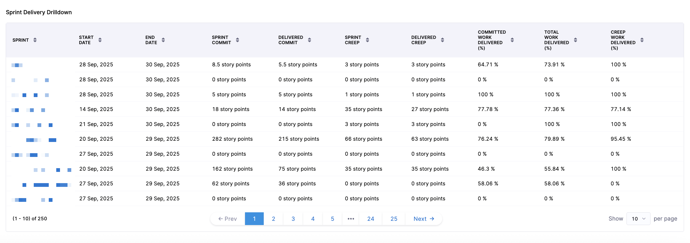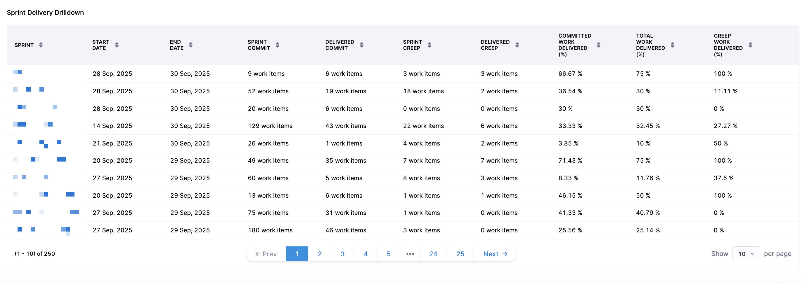 When you click into a sprint, you can access sprint-specific delivery performance and work item or story point-level drilldowns, allowing you to analyze which committed items were delivered, which creep items were added and delivered, which items were missed, and how individual work items contributed to sprint outcomes.