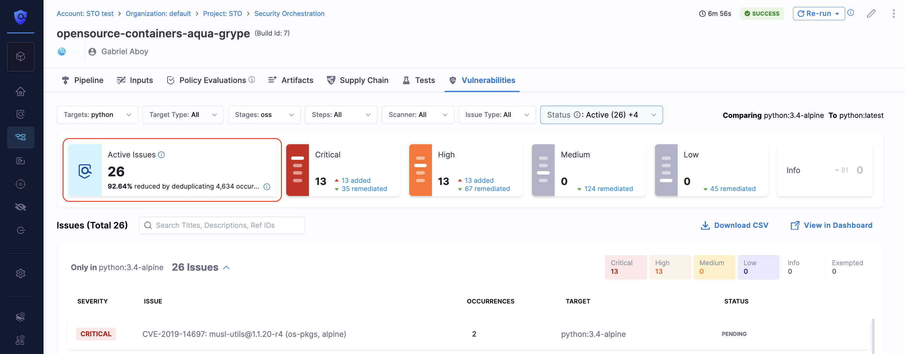 Security results for STO are now aggregated across all pipeline stages and executions, providing a single, complete view even when pipelines are resumed after a failure. This includes reruns of failed stages and chained pipelines. Previously, results from rerun failed stages or chained pipelines were not combined in the vulnerabilities tab (STO-10231 , ZD-84194, ZD-89153). This feature was behind Feature Flags
