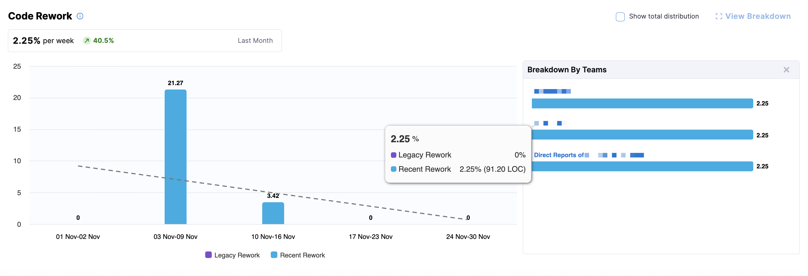 With Code Rework, you can configure how recent and legacy code is classified in a Productivity Profile, including the time window for recent code (set as 30 days, by default). This lets you analyze where rework is coming from and who is introducing it.